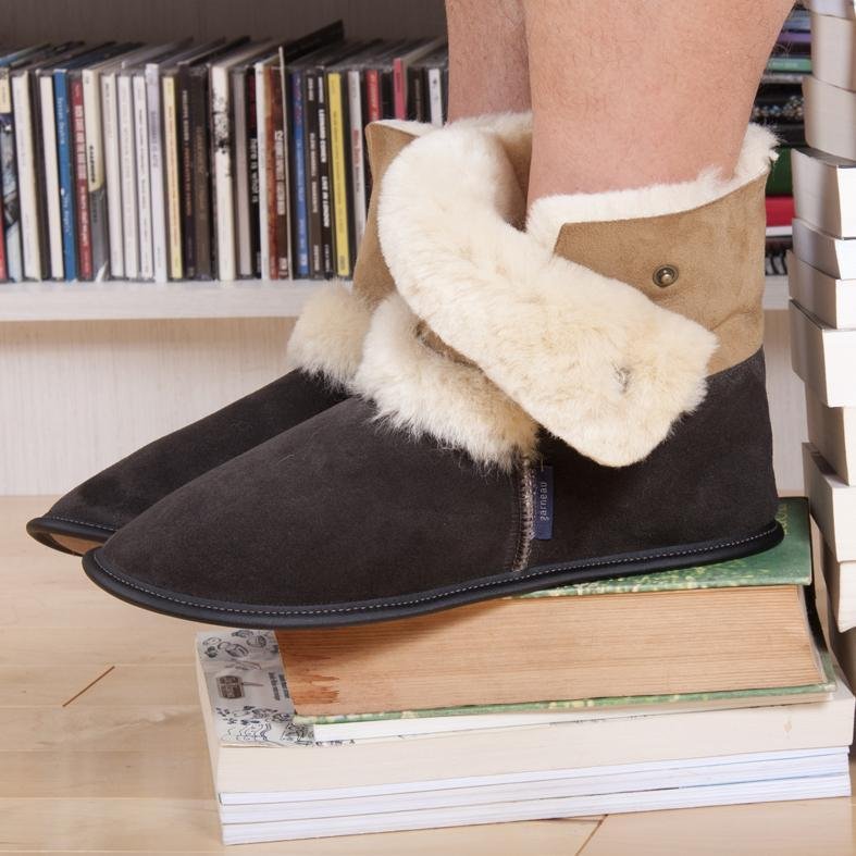Homme portant des pantoufles mouton et suède brun pour homme de style bottillon en mouton retourné